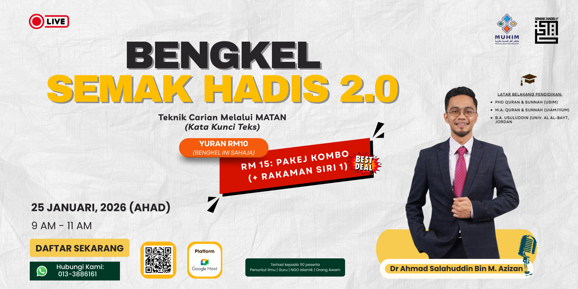 Bengkel Semak Hadis 2.0 telah berlangsung dengan jayanya pada 25 Januari 2026 secara atas talian. Sebagai kesinambungan kepada siri pertama, bengkel ini beralih daripada teknik asas kepada kemahiran yang lebih strategik dalam pencarian dan penilaian hadis, khususnya sebagai persediaan menghadapi bulan Ramadan 1447H.